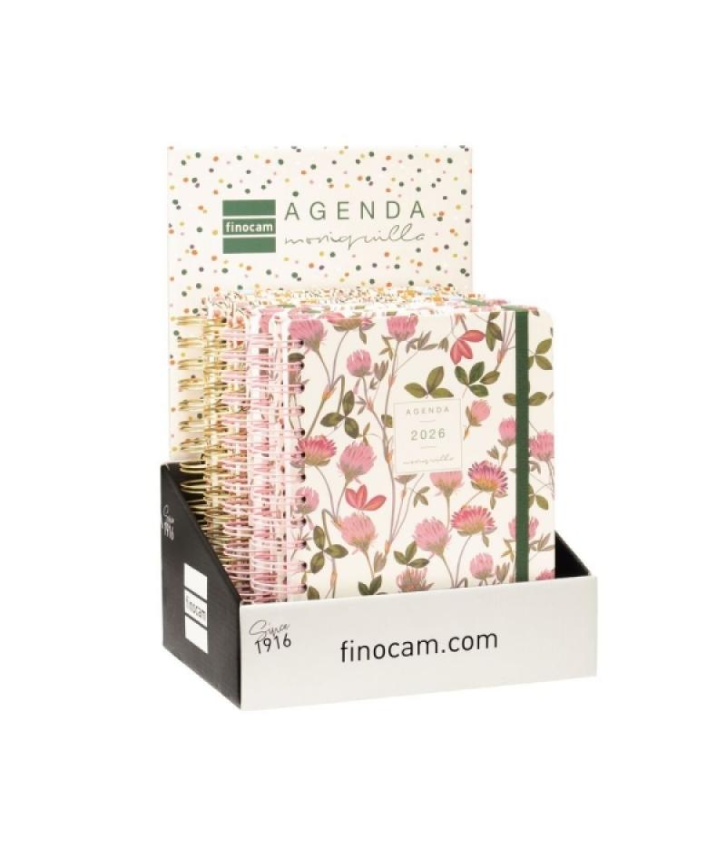 Finocam Moniquilla Expositor con 8 Agendas de Espiral Surtidas en Catalan - Anual 2026 - Planificador - Cierre de Goma - Formato