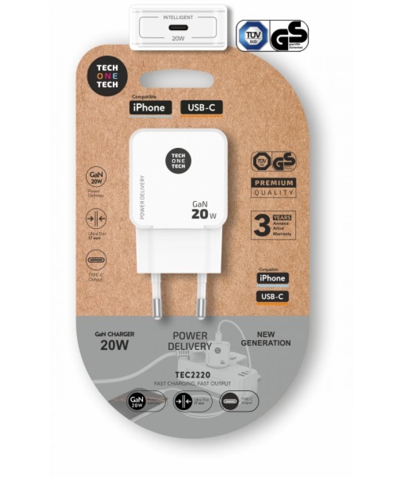 TechOneTech Cargador de Pared Ultrarrápido GaN 20w USB-C Blanco