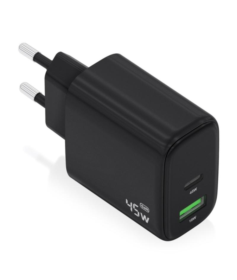 Aisens Cargador GAN 45W - 1xUSB-C PD3.0 QC4.0 y 1xUSB-A QC3.0 - Color Negro