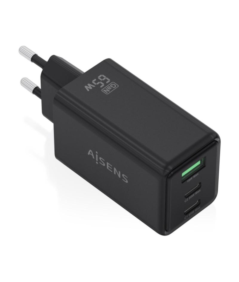 Aisens Cargador GAN 65W - 2xUSB-C PD3.0 QC4.0 y 1xUSB-A QC3.0 - Color Negro