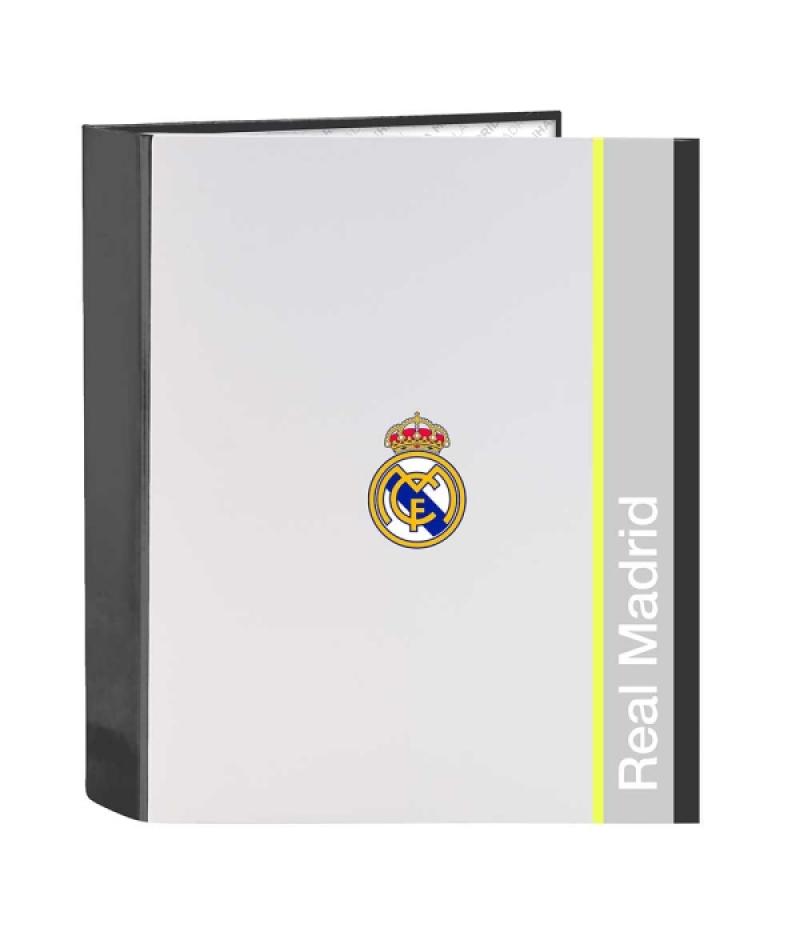 Safta Real Madrid Carpeta de 4 Anillas - Tapas Duras Forradas - Lomo de 60mm - Formato Folio - 27x33x6cm - Color Blanco y Negro