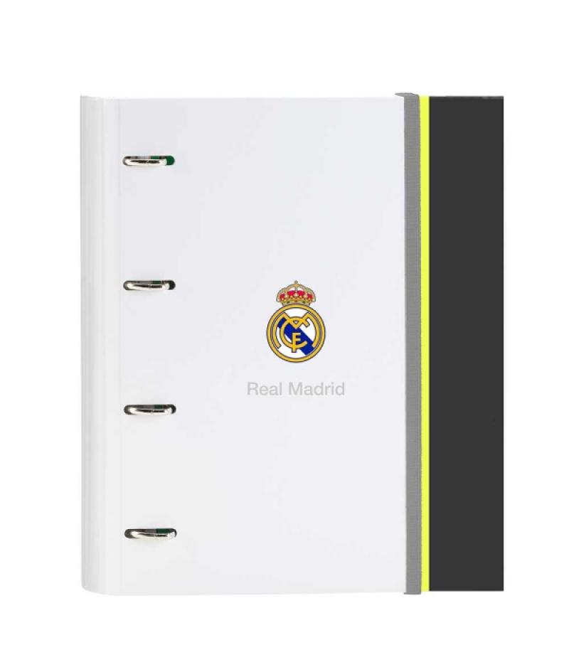Safta Real Madrid Carpeta de 4 Anillas - Tapas Duras Forradas - Lomo de 35mm - Incluye 100 Hojas A4 con Cuadriculada 5X5mm - 27x