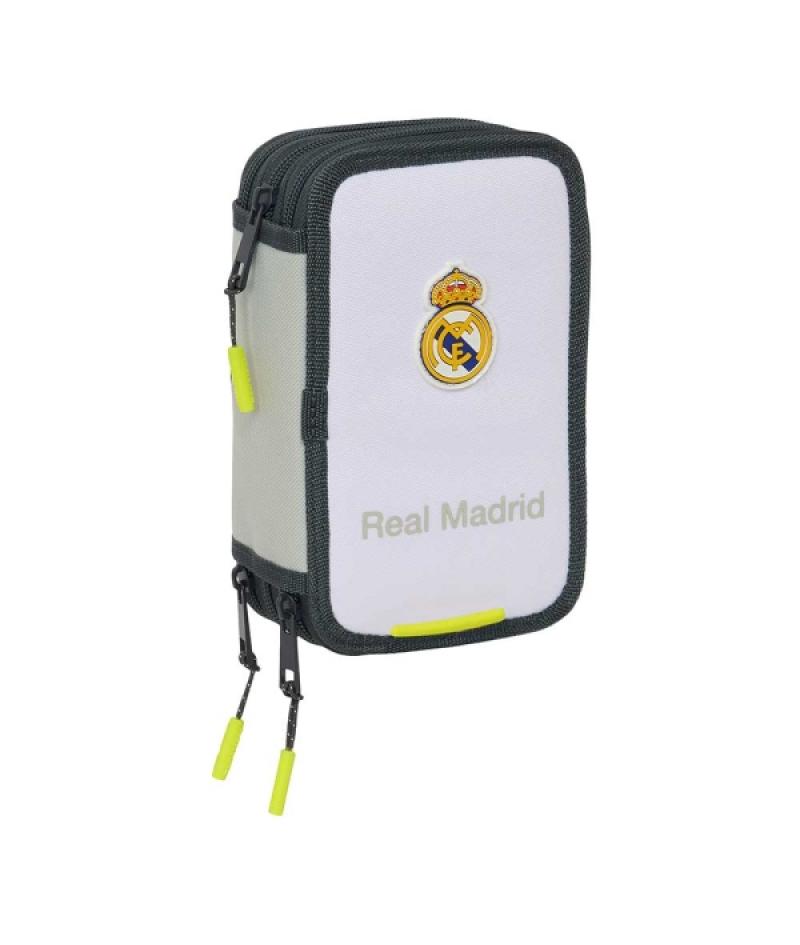 Safta Real Madrid Plumier de 1.3L con 37 Piezas - 3 Compartimentos - Cierre de Cremallera - 12.5x19.5x5.5cm - Color Blanco y Neg