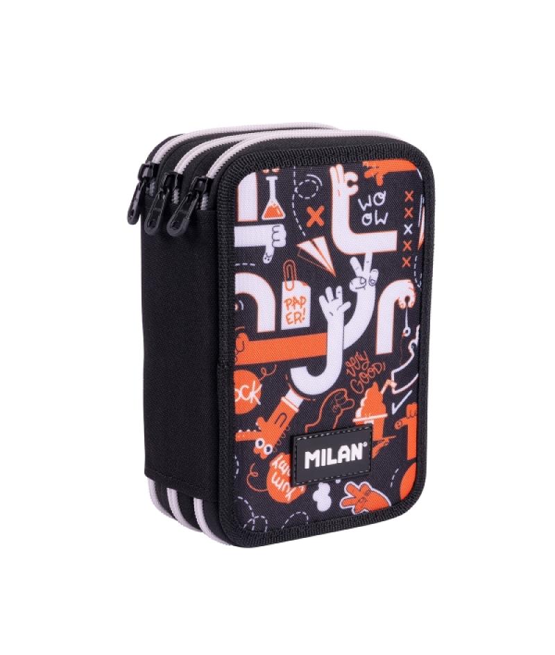 Papelería / Material de oficina - Material escolar y educativo - Estuches escolares, bolsos portatodo y plumier 397848 - Milan Fingers Plumier de 3 Pisos con Goma de Borrar - Sacapuntas - Lapiz - 3 Boligrafos - Regla - 12 Lapices de Colores - 6 Lapices de Colores Metalizados - 5 Fluorescentes - Tijeras y 18 Rotuladores - 19.5x13x7.5cm - Color NaranjaBeneficiario :