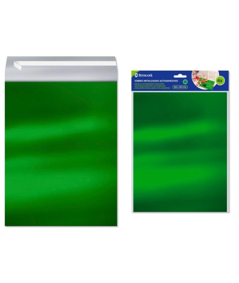 Bismark Pack de 4 Sobres Metalizados - Medidas 324x254mm - Cierre Autoadhesivo - Ideal para Regalos - Color Verde Metalizado