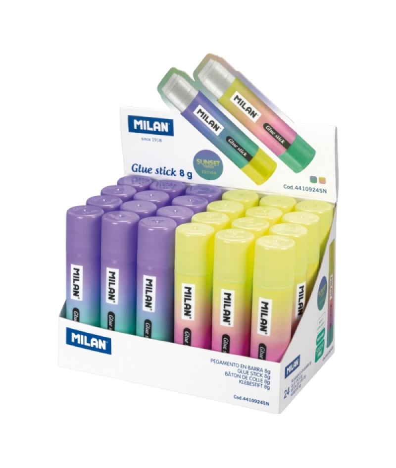 Papelería / Material de oficina - Manualidades - Pegamentos 399473 - Milan Sunset Expositor con 24 Barras de Pegamento 8g - Multiusos - Multisuperficies - Sin Disolventes - Uso Escolar - Colores SurtidosBeneficiario :