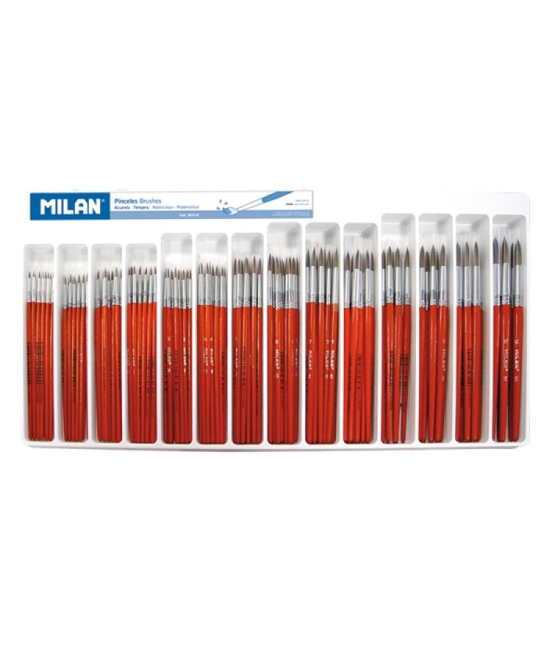 Milan 101 Pack de 144 Pinceles Escolares Redondos - Pelo de Cabra y Sintetico - Formatos Surtidos - Mango de Madera - Color Marr