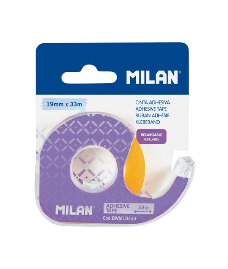Milan Portarrollos con Cinta Adhesiva - Cinta Amarillo Transparente - Hoja de Corte Metalica - 19mm x 33m - Color Lila