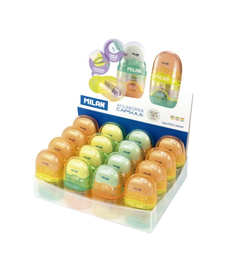 Milan Capsule New Look Expositor con 16 Afilaborras - Goma Miga de Pan - Deposito Integrado - Cuchilla de Acero de Seguridad - C