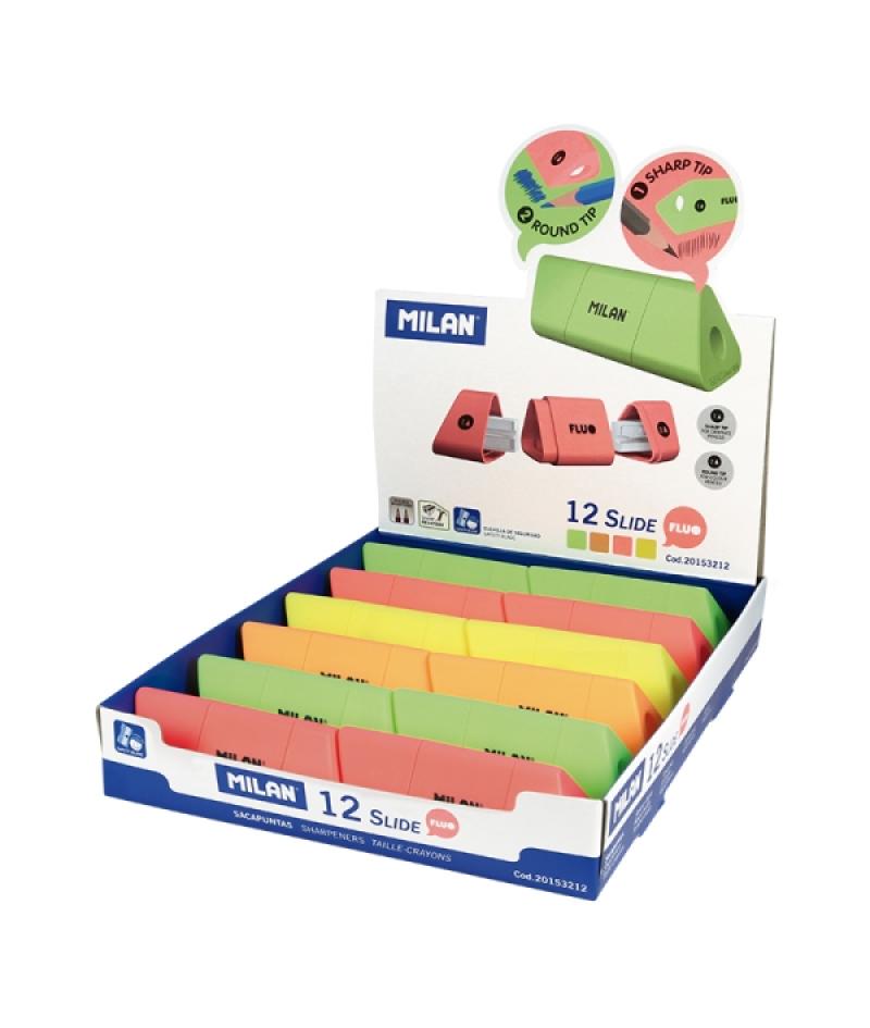 Milan Slide Fluo Expositor con 12 Sacapuntas - Colores Surtidos