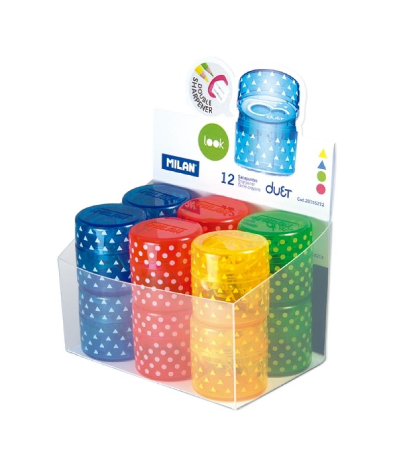 Papelería / Material de oficina - Escritura y corrección - Sacapuntas 397678 - Milan Duet Look Expositor con 12 Sacapuntas Doble - Regular y Maxi - Deposito Integrado - Cuchilla de Acero de Seguridad - Colores SurtidosBeneficiario :